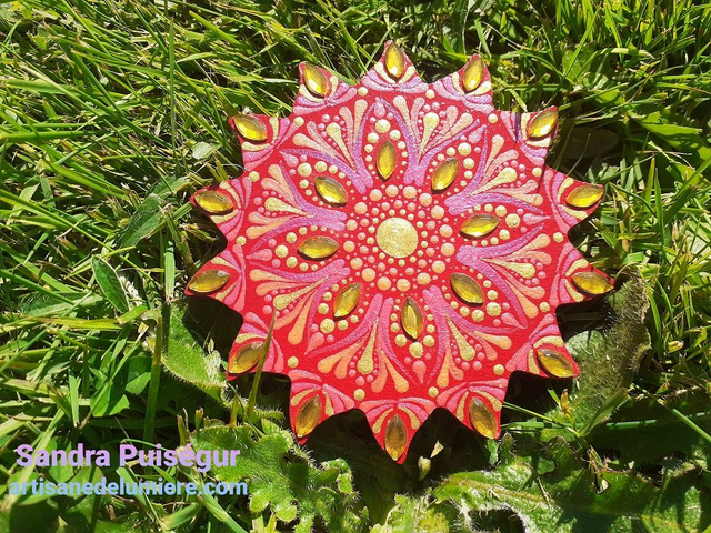 Soleil rouge en bois, peinture acrylique et vernis, 10*10 cm, épaisseur 0,7 cm, avec strass.