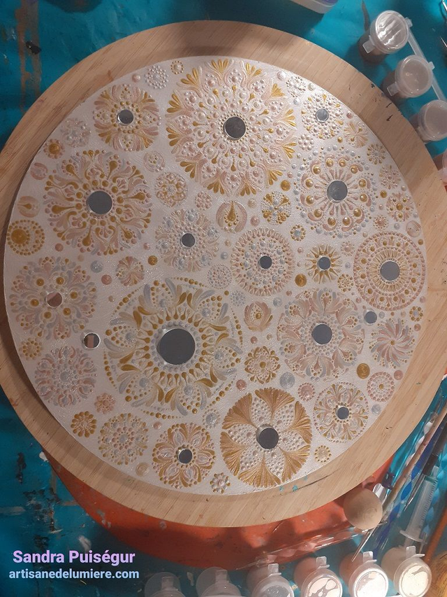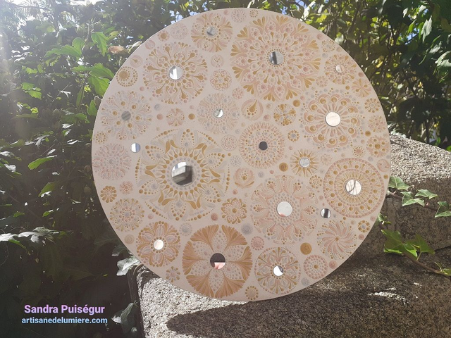 Cercle en bois, peinture acrylique et vernis, 30 cm de diamètre, épaisseur 0,2 cm, avec miroirs.
